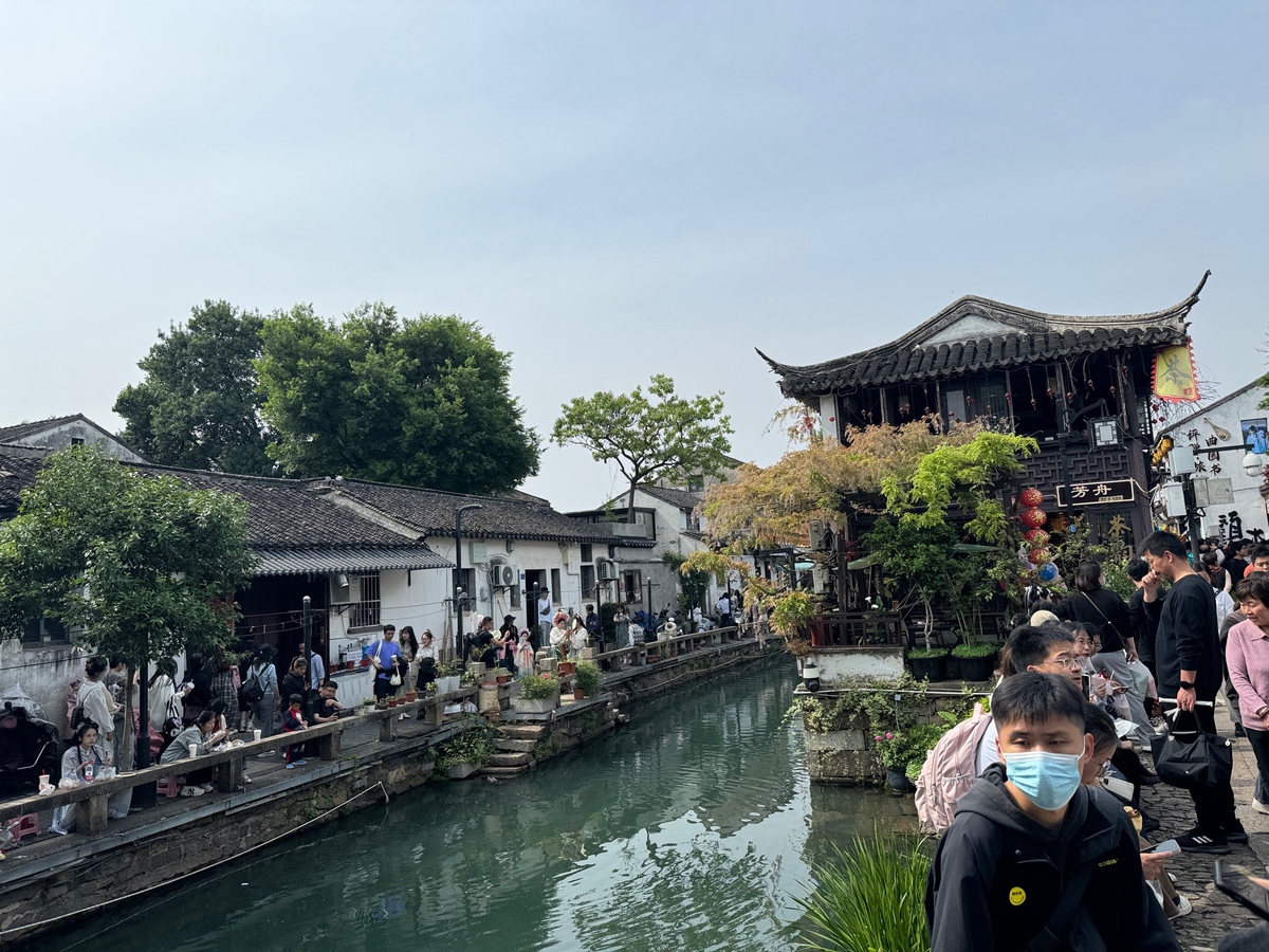 平江路上游客熙熙攘攘,走在“小桥流水、粉墙黛瓦”之间。一位苏州本地小伙带着他来自意大利的朋友来到街区游玩,他说,这里能让朋友直观地感受到江南水乡的风貌。据工作人员介绍,街区现存的布局与宋代《平江图》基本一致,保持着“水陆并行、河街相邻”双棋盘格局。