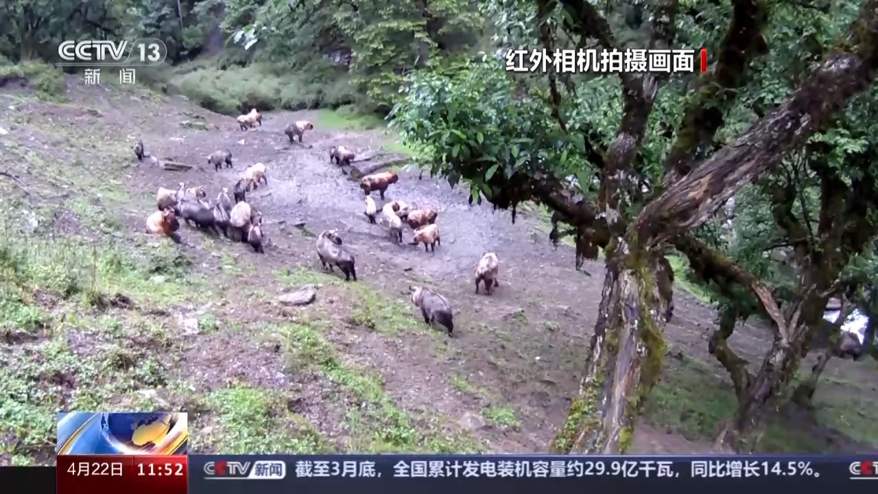 此次通过整理的红外相机还记录到国家一级保护动物羚牛近30多只聚集在一起的罕见画面。此外,还记录到国家一级保护动物雪豹的画面。据管护总站工作人员介绍,截至目前,大熊猫国家公园芦山片区布设红外相机210台,到目前已收集监测信息1.5万余条,先后监测到大熊猫、羚牛、小熊猫等野生动物。