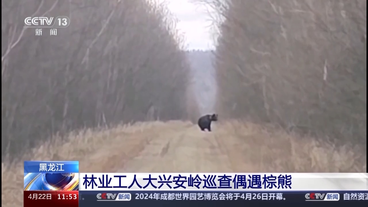 最近(4月18日),在黑龙江大兴安岭地区,林业工人进山做清查工作时,意外发现一只外出觅食的棕熊,在听到人类的动静后窜进山林里。