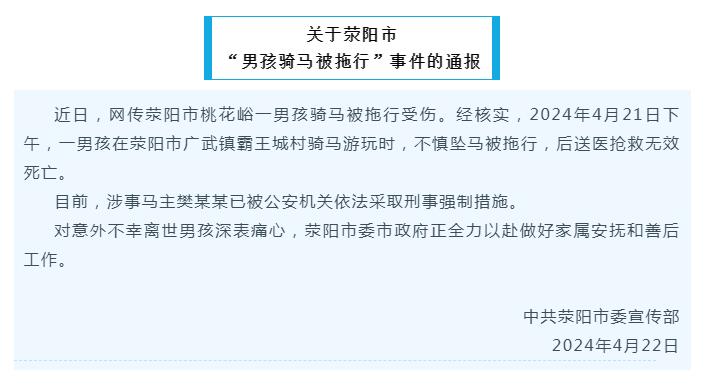 关于荥阳市 “男孩骑马被拖行”事件的通报
