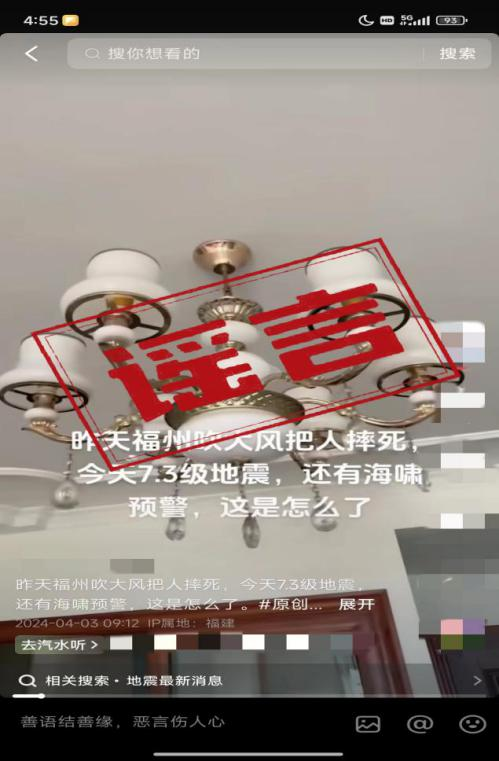 2024年4月3日,台湾地区发生地震,福州震感强烈。袁某为蹭热度、引流量、博关注,随意虚构事实,其拍摄一段天花板挂灯的视频,发布至网络平台,并配上醒目文字称“昨天福州吹大风把人摔死,今天7.3级地震还有海啸预警,这是怎么了”。袁某故意编造传播谣言信息,立即引起不少网民的关注。