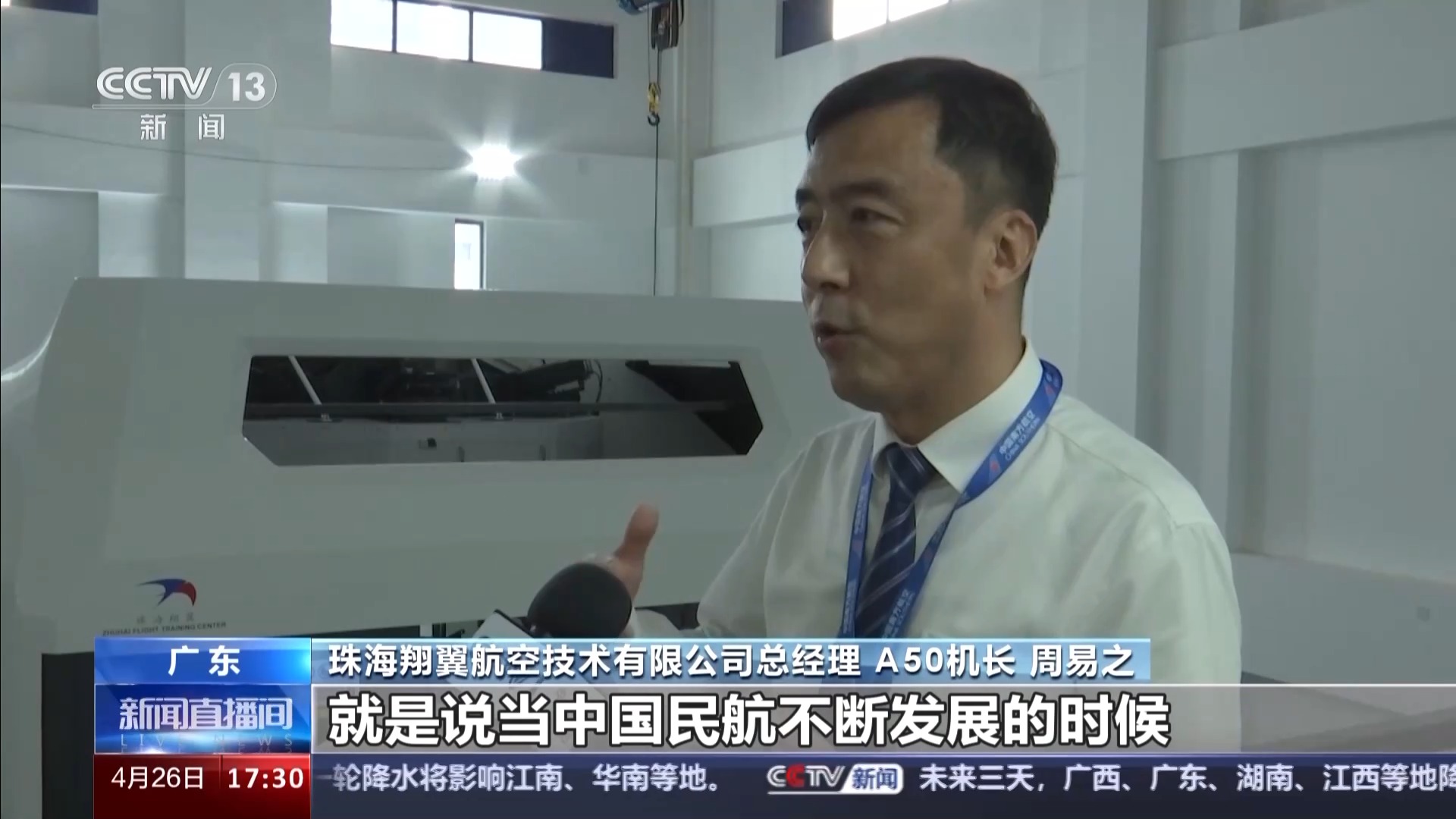 珠海翔翼航空技术有限公司总经理 A50机长 周易之:未来,当中国民航不断发展的时候,我们有更多的飞机,那就意味着我们(需要)更多中国特色的模拟机,未来满足中国市场的需要,也满足国际上航空公司对模拟机的需求。所以未来国内市场、国际市场前景都非常看好。