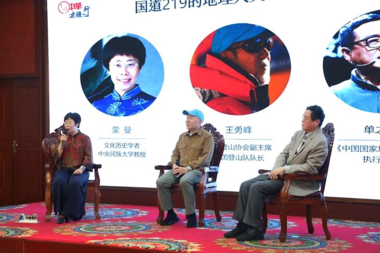 围绕即将正式启程的“曼行国道·219”活动,现场还举行了“曼谈沙龙”,蒙曼教授与特邀嘉宾——中国登山协会副主席、中国登山队队长王勇峰,《中国国家地理》杂志执行总编单之蔷,围绕219沿途的自然地理、人文历史、民族风俗等话题展开了对话。蒙曼教授分享了她对于219国道沿途历史文化、各民族生活情态和非遗传承等内容的了解和期待;单之蔷结合亲身经历,分享了他对于219国道壮美景色和地理景观的印象;王勇峰则从户外安全角度,对219国道沿线需要注意的事项进行了安全讲解和现场指导。