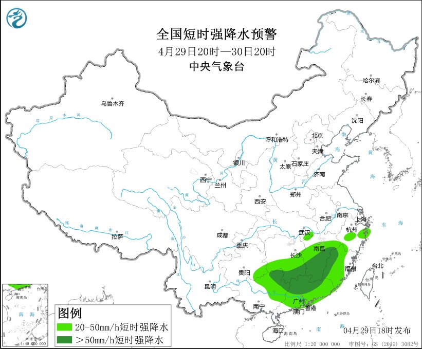 预计4月29日20时至30日20时,湖南南部、江西中南部、浙江东北部、福建中西部、贵州东南部、广西北部和东部、广东中北部等地的部分地区将有8级以上雷暴大风或冰雹天气,其中湖南南部、江西东部和南部、广东中北部、福建西北部、广西东北部等地的部分地区将有10级以上雷暴大风,最大风力12级以上,并可能有龙卷;湖北东南部、湖南中南部、江西、浙江中部、福建中西部、贵州东南部、广西东部和北部、广东等地的部分地区将有小时雨量大于20毫米的短时强降水天气,其中湖南南部、广西东北部、广东中北部、江西中南部、福建西部等地局地最大小时雨量大于50毫米,最大可达80毫米以上。