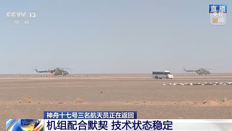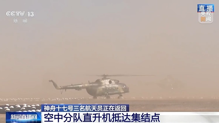 今天上午8点43分左右,神舟十七号飞船搭载着神舟十七号航天员乘组,成功撤离中国空间站,踏上回家之路。目前,神十七乘组状态良好。按计划,神舟十七号载人飞船预计今天下午返回东风着陆场。此刻,在东风着陆场,神舟十七号搜救回收空中分队5架直升机也正在飞抵空中分队集结点。