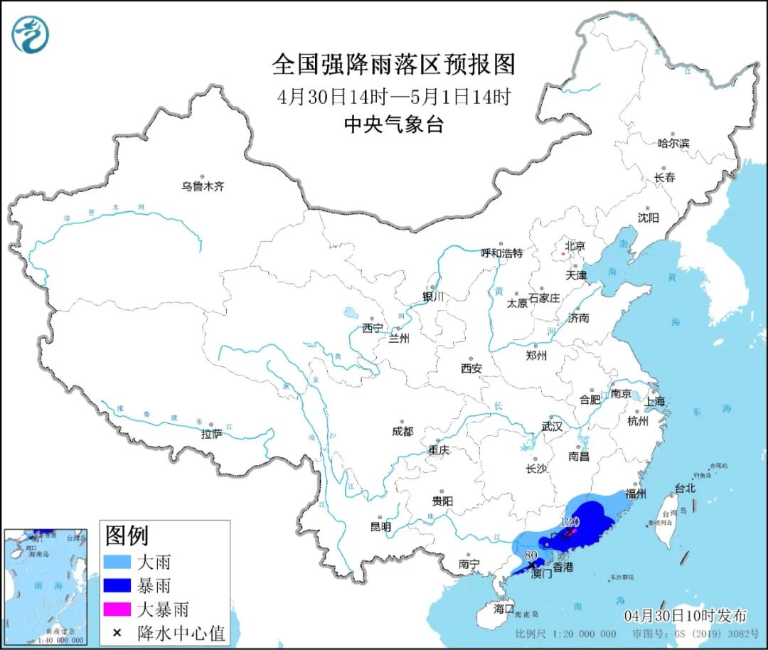 中央气象台今天(4月30日)10时继续发布暴雨黄色预警:预计,4月30日14时至5月1日14时,江西南部、福建中南部、广西东部、广东中南部等地部分地区有大到暴雨,其中,广东中东部局地有大暴雨(100~120毫米)。上述部分地区伴有短时强降水(最大小时降雨量30~60毫米,局地可超过80毫米),局地有雷暴大风或冰雹等强对流天气。