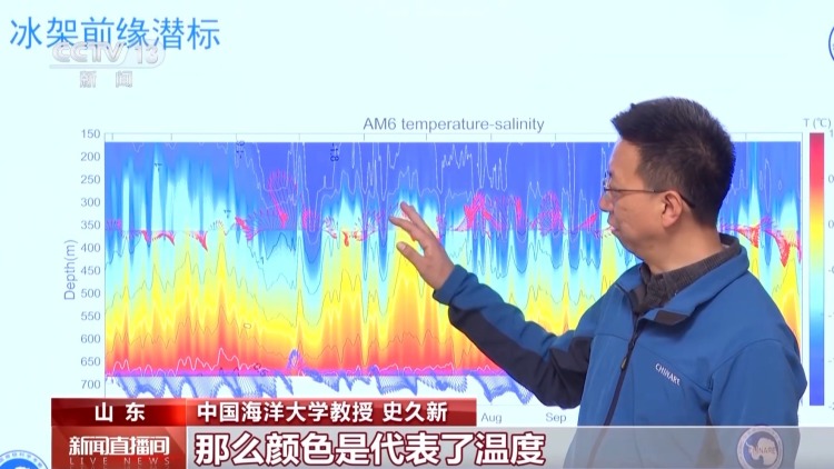 中国海洋大学教授 史久新:这是我们第40次南极考察期间回收的冰架前缘潜标的结果,颜色是代表温度,红色就是高温的水在底层,蓝色的箭头代表了流动的方向,也是上北下南。整个都是向南运动,说明在底层有大量的暖水进入了冰架的下面。