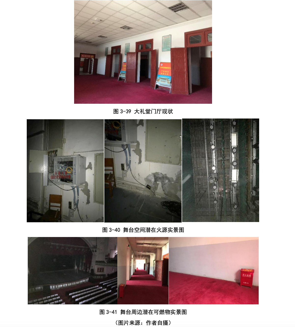 这篇论文指出,河南大学教育建筑遗产群火灾荷载大、火灾隐患多、疏散条件不足、自救能力弱、消防设施不完善,尤其是大礼堂作为观演场地,自身存在的火灾危险性较高。潜在的火灾因素包括:电气火灾,如原有电气线路老化,电气设备增多,用电荷载过大;用火不慎,使用人员室内吸烟、违规使用大功率,管理人员做饭、取暖、照明等生活用火引发,维修施工时操作不当或使用的明火工具不慎引燃室内可燃物;雷击,不可抗力因素引发。