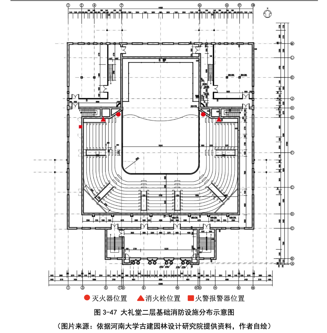 消防设施方面,大礼堂观众厅外的走廊里每隔10m便放置有一个落地式灭火器箱,但部分区域的灭火器已达到报废年限。在舞台两侧还装有室内消防栓,但二层区域存在无法正常开启消防栓箱门的现象。大礼堂装有火灾报警器、烟雾报警器和自动喷淋设施,但缺少电气火灾监控系统,且部分消防装置、设备较为陈旧老化。由于大礼堂建设时间过早,建筑结构较为固定,屋顶钢架所能承载的荷载也有一定的限制性,因此一些需要安装在屋架上和天花板中的现代消防设施无法得到有效布置,这些客观条件都制约着大礼堂内防火技术的发展。