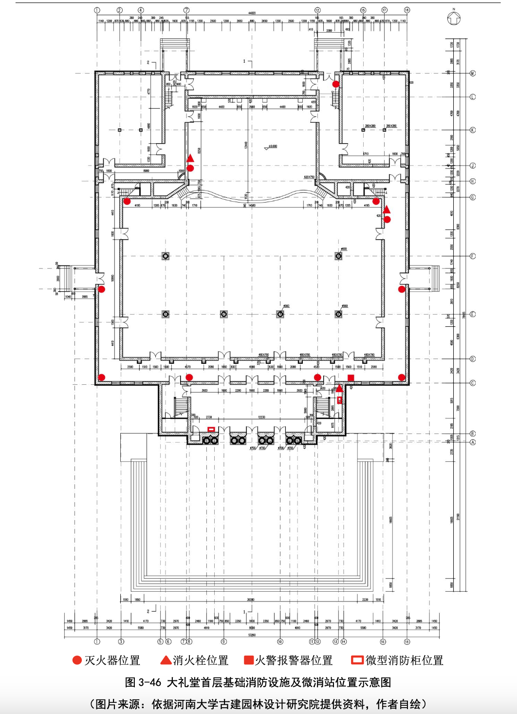 大礼堂首层基础消防设施及微消站位置示意图。论文截图