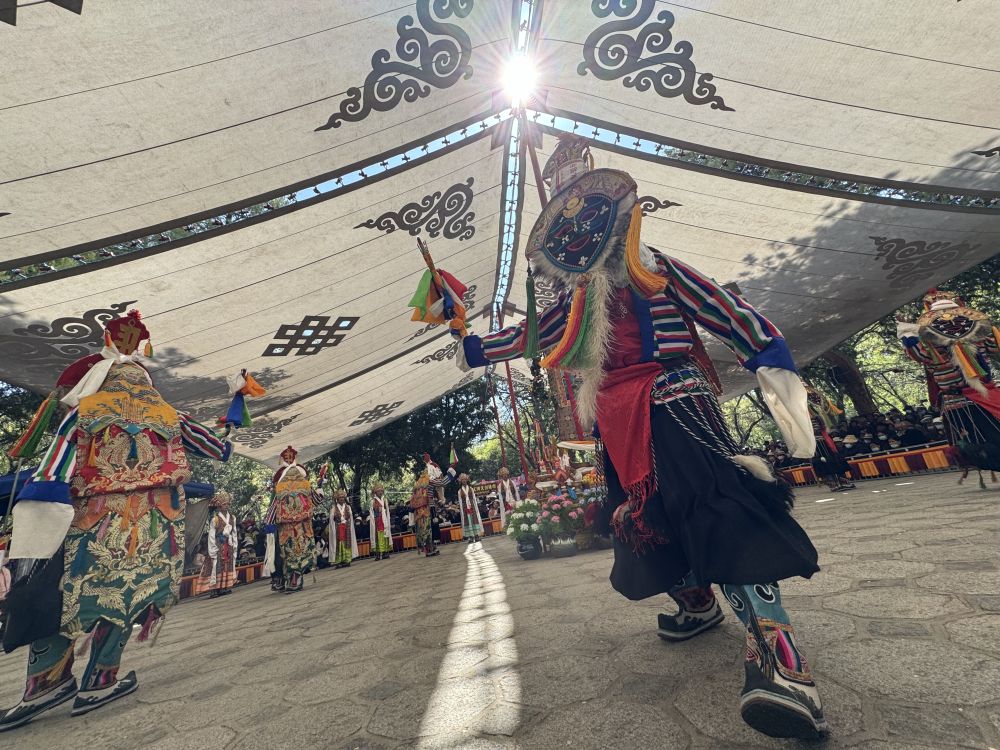 广场中央戏台上,鼓点轻快、钹声铿锵,戴着黄面白发面具的藏戏演员唱腔高亢激昂;台下,观众聚精会神,不时随着演员表演一起大笑。