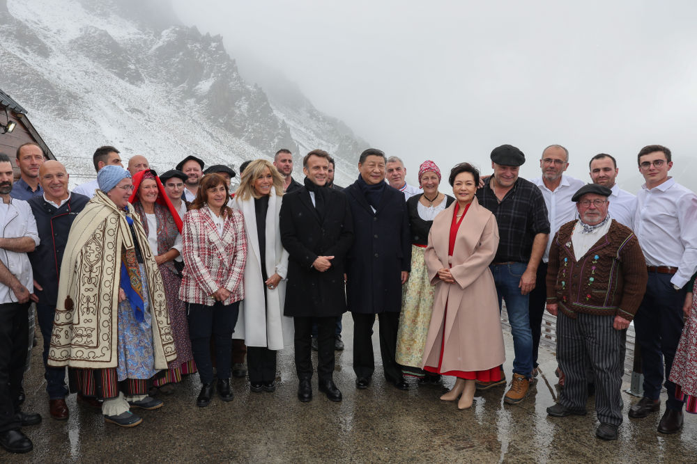 马克龙总统和布丽吉特在图尔马莱山口“牧羊人驿站”迎接习近平和彭丽媛,共同欣赏当地村民表演的具有浓郁南法风情的牧羊人之舞,并同他们亲切合影。