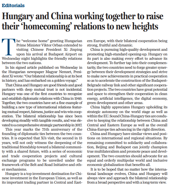当前,中国正着力推动高质量发展和高水平对外开放,匈牙利也在全力推进自身发展。匈牙利是中国在中东欧地区投资的第一目的地和重要贸易伙伴,双边合作强劲、富有成果、充满活力。为进一步发挥双方优势,两国需要进一步加强发展战略对接,努力在务实合作上取得新成果,加快推进匈塞铁路等重大合作项目。两国在清洁能源、人工智能、数字经济、绿色发展等领域加强合作的潜力和空间巨大。