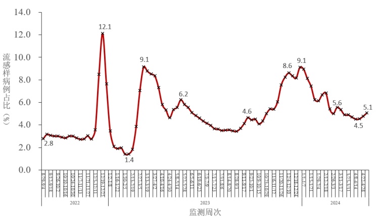图3-1 全国哨点医院报告的流感样病例占比变化趋势