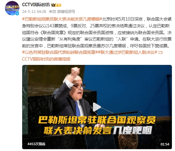 北京时间5月10日深夜,联合国大会紧急特别会议以143票赞成、9票反对、25票弃权的表决结果通过决议,认定巴勒斯坦国符合《联合国宪章》规定的联合国会员国资格,应被接纳为联合国会员国。决议建议安理会重新“从有利角度”审议巴勒斯坦的“入联”申请。在联大进行投票前的发言中,巴勒斯坦常驻联合国观察员曼苏尔几度哽咽,呼吁各国投下赞成票。