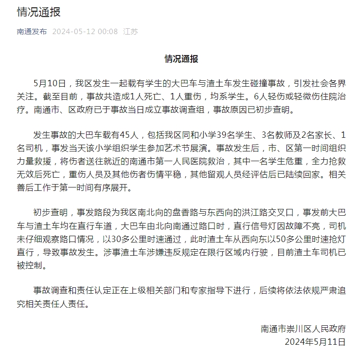 发生事故的大巴车载有45人,包括我区同和小学39名学生、3名教师及2名家长、1名司机,事发当天该小学组织学生参加艺术节展演。事故发生后,市、区第一时间组织力量救援,将伤者送往就近的南通市第一人民医院救治,其中一名学生危重,全力抢救无效后死亡,重伤人员及其他伤者伤情平稳,其他留观人员经评估后已陆续回家。相关善后工作于第一时间有序展开。