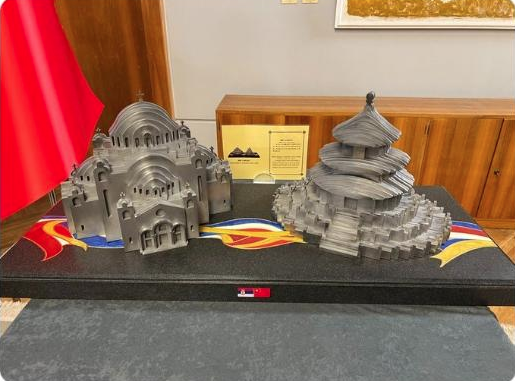 在塞尔维亚,两国元首举行会谈后,习近平主席送给武契奇两件用钢材制作的工艺品,分别是天坛和圣萨瓦教堂造型。武契奇很有兴趣,上前仔细端详。