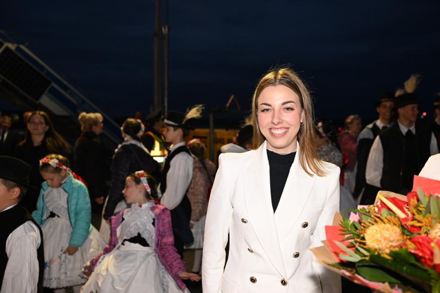 当习近平主席走下舷梯,一位女青年迎上前去献上一束鲜花,高兴地说:“习主席,欢迎您来到匈牙利!”