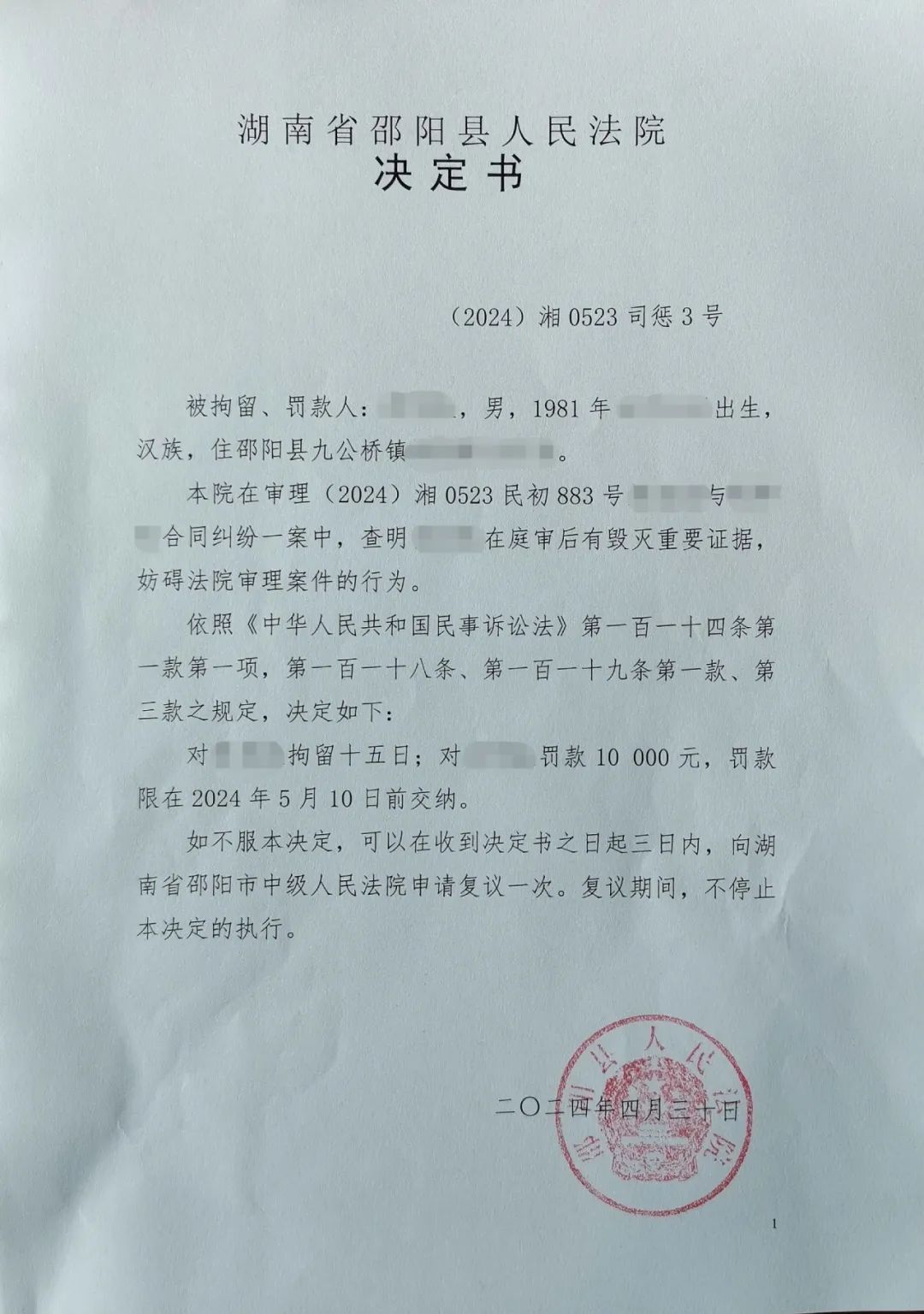 鉴于肖某毁损证据原件的行为符合毁灭重要证据,妨碍人民法院审理案件的情形,根据《中华人民共和国民事诉讼法》之规定,综合其认错态度,邵阳县人民法院依法作出《决定书》,决定对肖某司法拘留15日,罚款10000元。