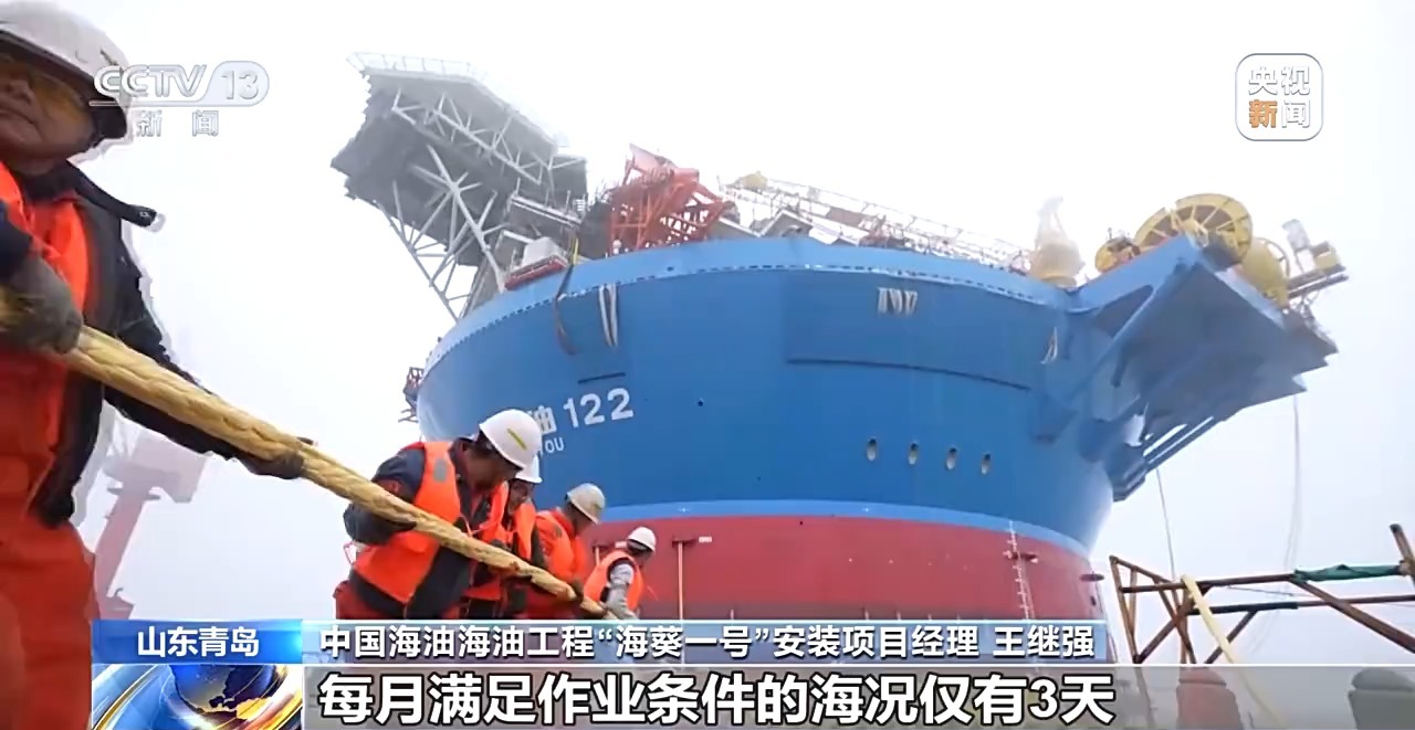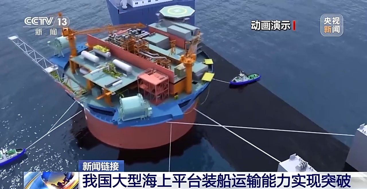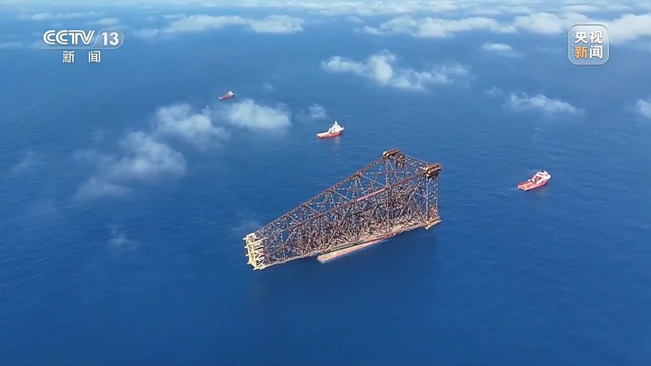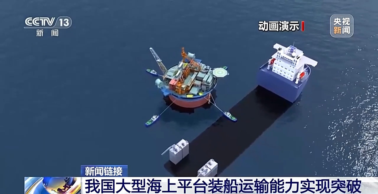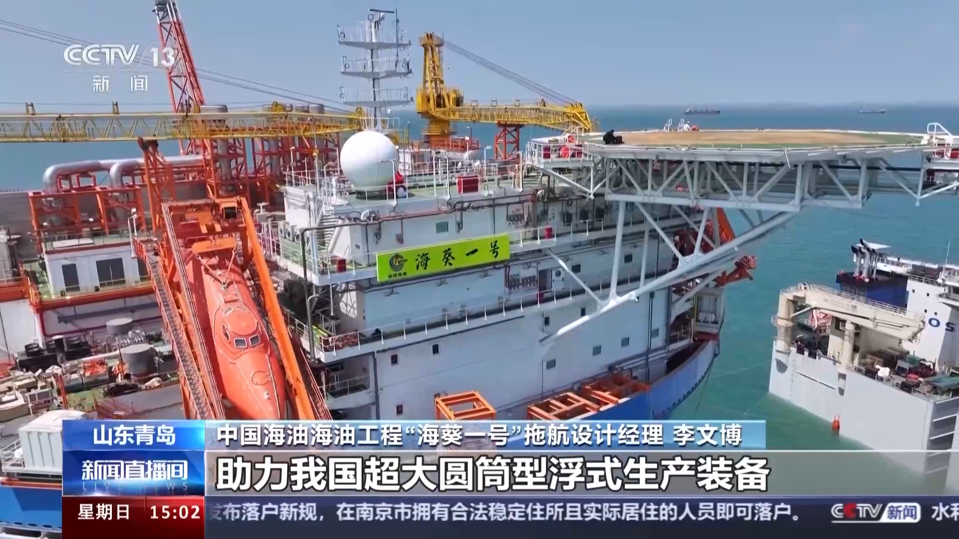 总台央视记者 张丛婧:这里是青岛胶州湾,我现在就在“海葵一号”装船作业的现场。从今天早上五点开始出港,现在“海葵一号”已经成功搭乘上了 “新光华号”半潜船。光是装船,就持续了三个多小时,我们也记录下了全过程。现在大家看到的画面,就是最精彩的进船过程,四条拖轮和半潜船的四条交叉缆绳,正从不同方向精确控制着“海葵一号”的庞大身躯,缓缓抵达预定位置,这个过程就像是“穿针引线”一样。而且进船的两侧间隙误差和就位精度,都要求控制在50毫米以内,在波涛汹涌的大海上,要完成这样的高精度操作,是非常难的。可以看到,目前半潜船正在缓缓上浮,等甲板全部浮出水面后,还将进行装船固定等后续作业,从而保证它在海上运输过程中即使遇到大的风浪也能够安全稳定。