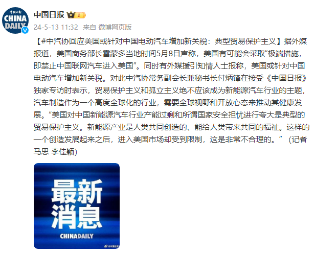 据外媒报道,美国商务部长雷蒙多当地时间5月8日声称,美国有可能会采取“极端措施,即禁止中国联网汽车进入美国”。同时有外媒援引知情人士报称,美国或针对中国电动汽车增加新关税。对此中汽协常务副会长兼秘书长付炳锋在接受《中国日报》独家专访时表示,贸易保护主义和孤立主义绝不应该成为新能源汽车行业的主题,汽车制造作为一个高度全球化的行业,需要全球视野和开放心态来推动其健康发展。“美国对中国新能源汽车行业产能过剩和所谓国家安全担忧进行夸大是典型的贸易保护主义。新能源产业是人类共同创造的、能给人类带来共同的福祉。这样的一个创造发展起来之后,进入美国市场却受到限制,这是非常不合理的。” (记者 马思 李佳颖)