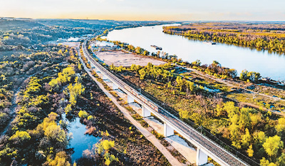匈塞铁路贝诺段,火车在多瑙河畔疾驰。