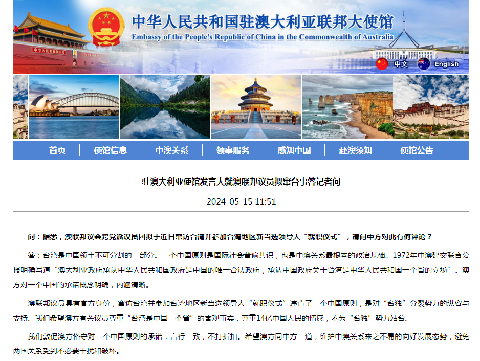 驻澳大利亚使馆发言人就澳联邦议员拟窜台事答记者问