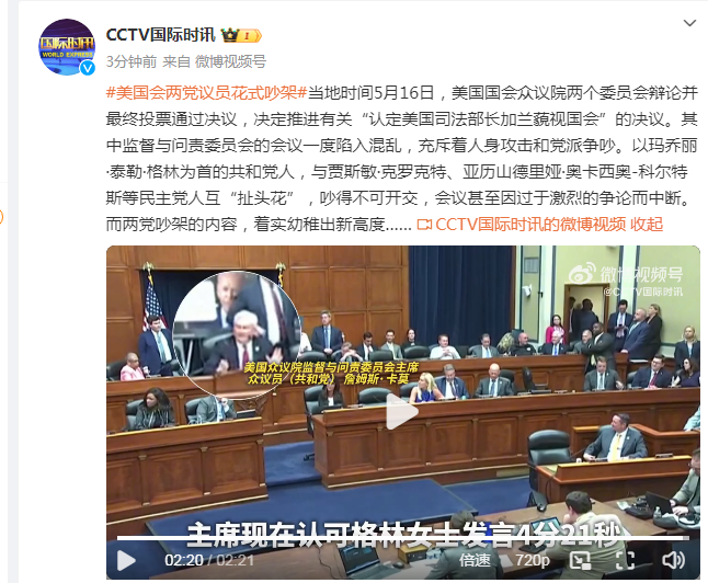 当地时间5月16日,美国国会众议院两个委员会辩论并最终投票通过决议,决定推进有关“认定美国司法部长加兰藐视国会”的决议。其中监督与问责委员会的会议一度陷入混乱,充斥着人身攻击和党派争吵。以玛乔丽·泰勒·格林为首的共和党人,与贾斯敏·克罗克特、亚历山德里娅·奥卡西奥-科尔特斯等民主党人互“扯头花”,吵得不可开交,会议甚至因过于激烈的争论而中断。而两党吵架的内容,着实幼稚出新高度……