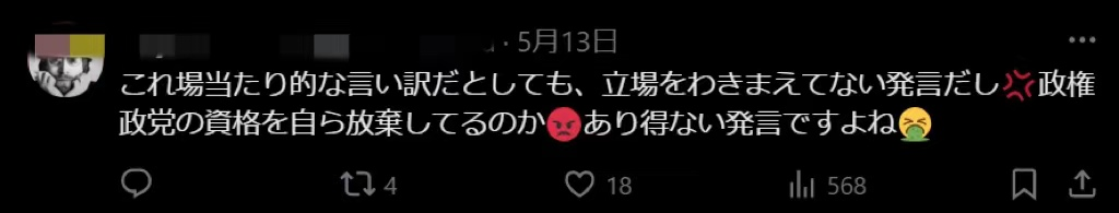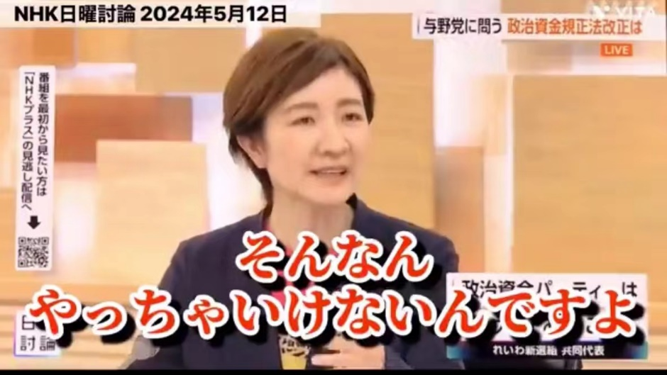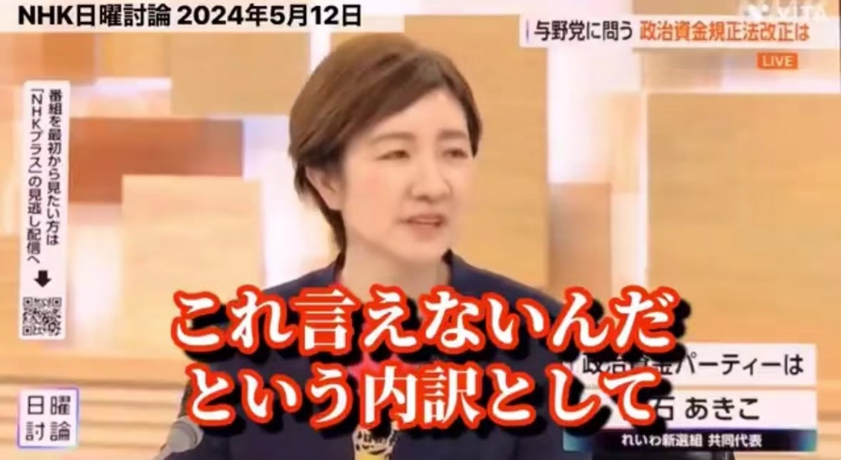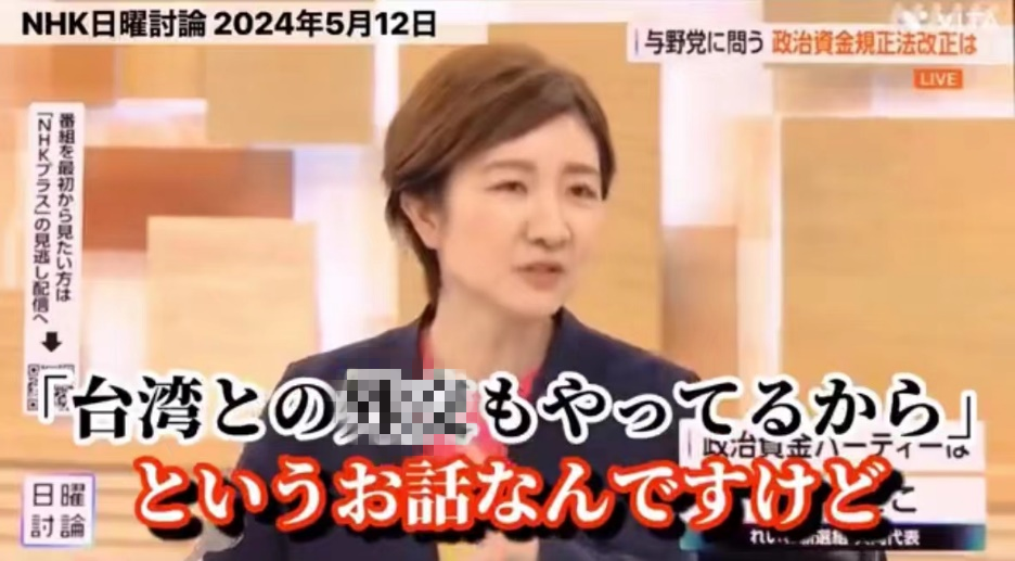 日本在野党令和新选组众议员、共同代表大石晃子当即表示对其此番发言“感到震惊”,她说,“花费数十亿日元的政策活动经费,而所谓不能说出口的明细(即资金用途),竟然是‘用于开展和台湾的外交(关系)’,这是不应该做的事情。”(如下图)