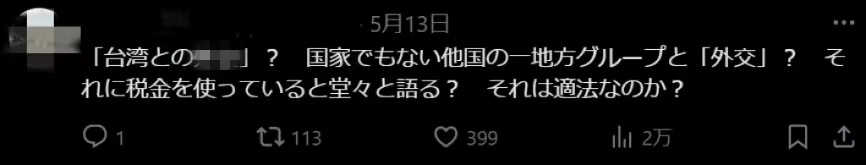 日本自民党议员公然声称政治资金用于“对台关系”的言论在社交媒体上引发广泛的批评和质疑,有网民评论称: