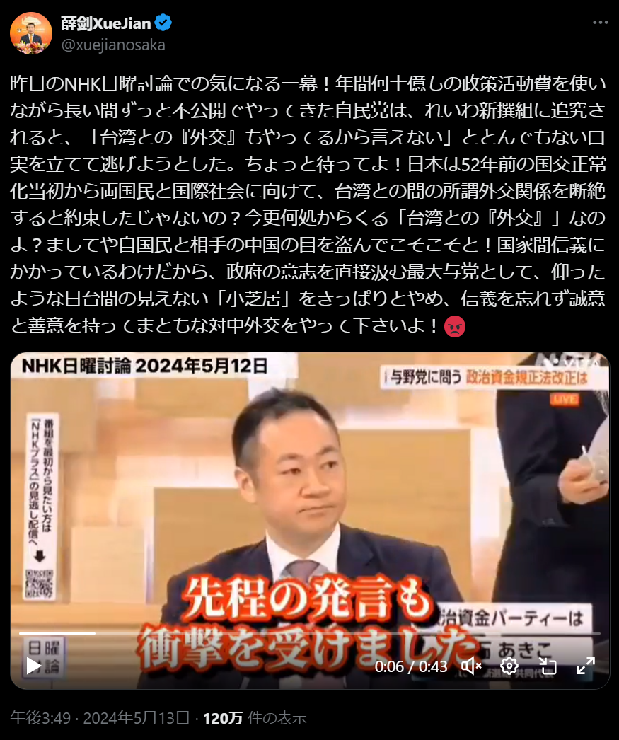 中国驻大阪总领事薛剑在社交媒体上发文称(如下图),自民党每年花费数十亿日元的政策活动经费,却长期不公开(资金去向),在在野党令和新选组的追问下,竟然试图用“因为(用于和)台湾的‘外交’,所以不能说”为借口搪塞过去。