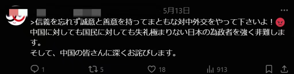 “对于日本政客对中国、对国民极为不尊重的行为,表示强烈谴责。我想向所有中国人民表示诚挚的歉意。”