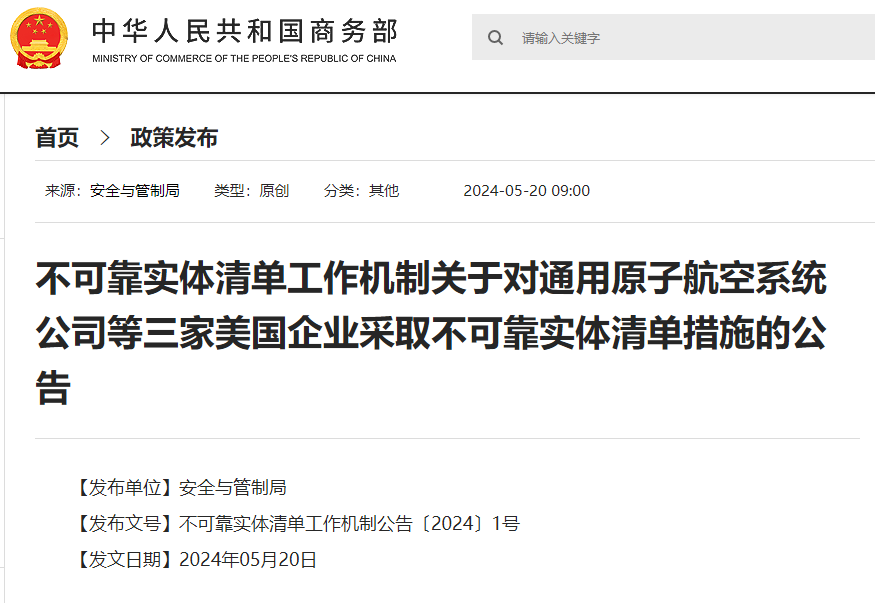 不可靠实体清单工作机制关于对通用原子航空系统公司等三家美国企业采取不可靠实体清单措施的公告