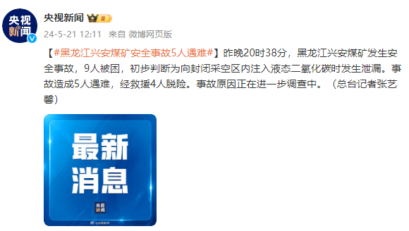 昨晚20时38分,黑龙江兴安煤矿发生安全事故,9人被困,初步判断为向封闭采空区内注入液态二氧化碳时发生泄漏。事故造成5人遇难,经救援4人脱险。事故原因正在进一步调查中。(总台记者张艺馨)