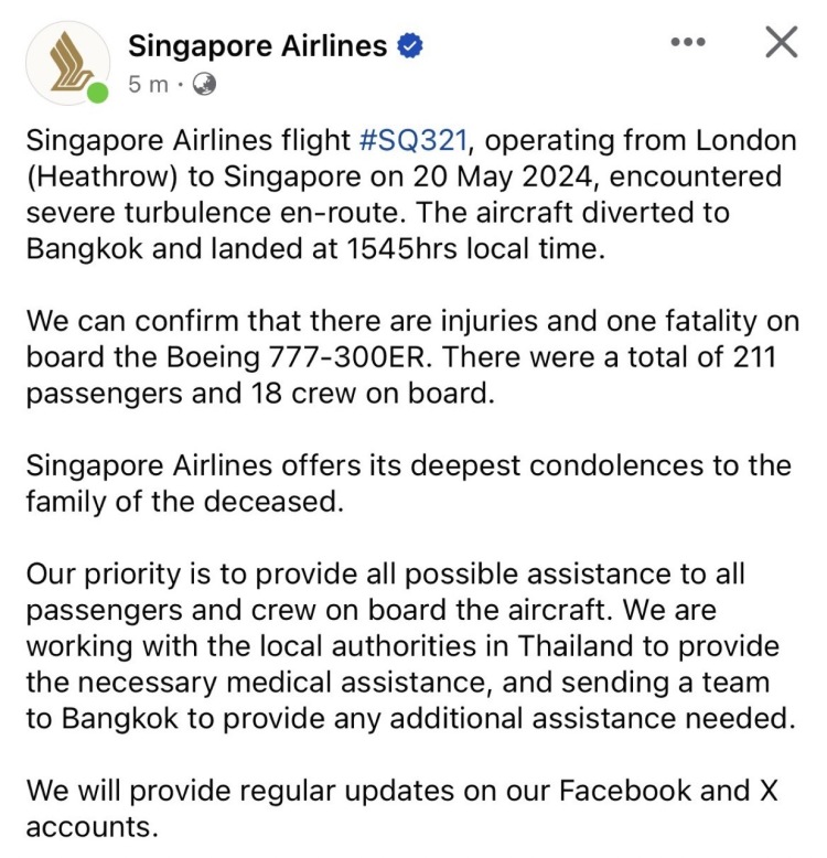 新加坡航空公司随后发布消息,证实这架777-300型客机遭遇湍流并备降曼谷,机上1人死亡,多人受伤。新航向死者家属表示最深切的哀悼。