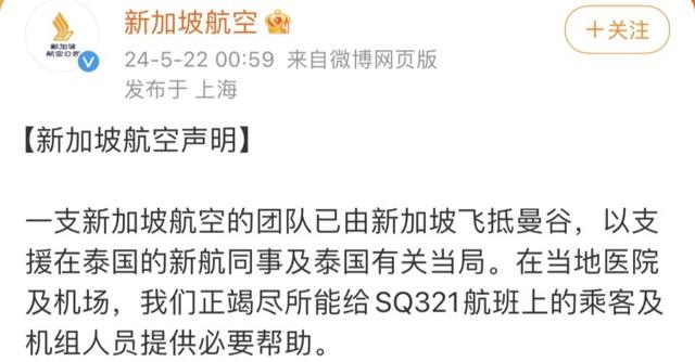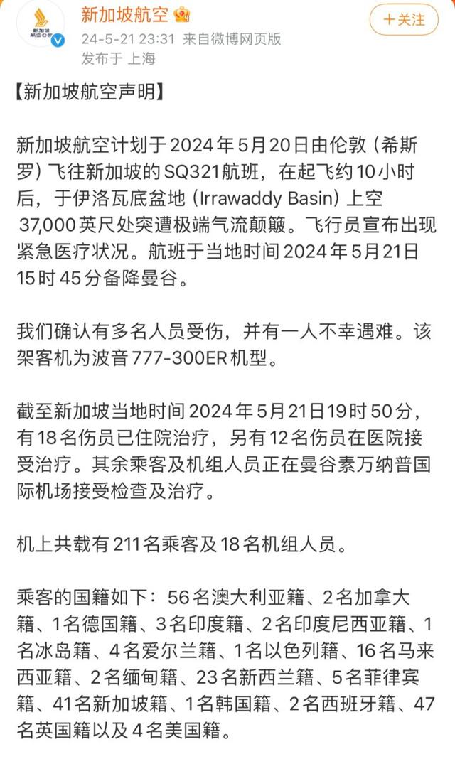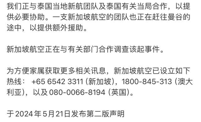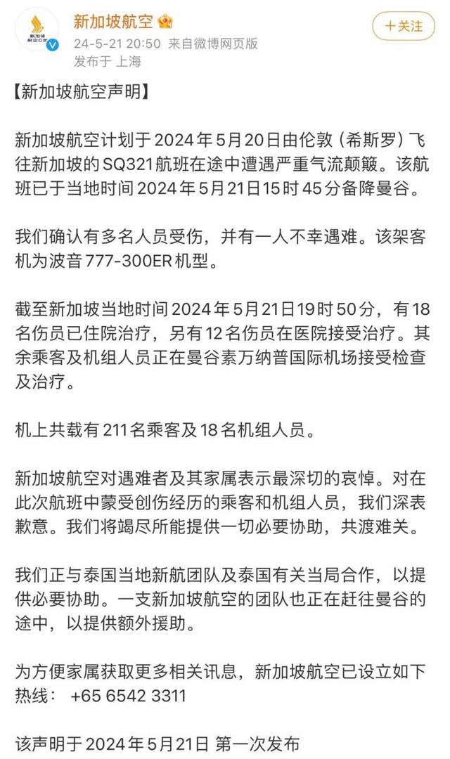 当地时间5月21日,新加坡航空SQ321航班在从英国希思罗机场至新加坡樟宜机场途中遭遇严重颠簸,于15时45分改航备降曼谷素万那普机场。事故至少造成1人死亡,多人受伤。事件发生后,新加坡航空连发四则声明对事件进行公布。