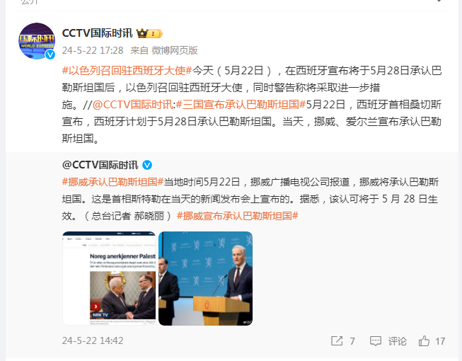 今天(5月22日),在西班牙宣布将于5月28日承认巴勒斯坦国后,以色列召回驻西班牙大使,同时警告称将采取进一步措施。此前报道:5月22日,西班牙首相桑切斯宣布,西班牙计划于5月28日承认巴勒斯坦国。当天,挪威、爱尔兰宣布承认巴勒斯坦国。