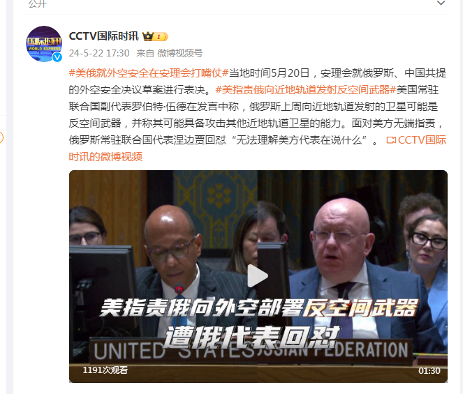 当地时间5月20日,安理会就俄罗斯、中国共提的外空安全决议草案进行表决。美国常驻联合国副代表罗伯特·伍德在发言中称,俄罗斯上周向近地轨道发射的卫星可能是反空间武器,并称其可能具备攻击其他近地轨道卫星的能力。面对美方无端指责,俄罗斯常驻联合国代表涅边贾回怼“无法理解美方代表在说什么”。