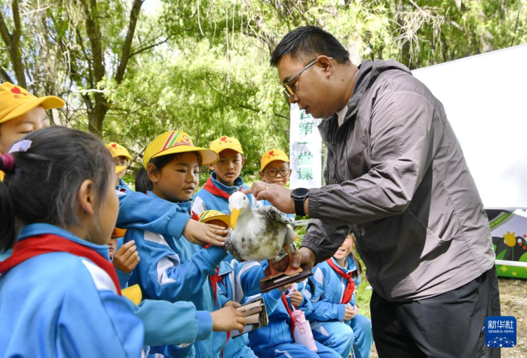 5月22日,西藏大学生态环境学院助理实验师朱文琎向小学生展示鸟类标本。
