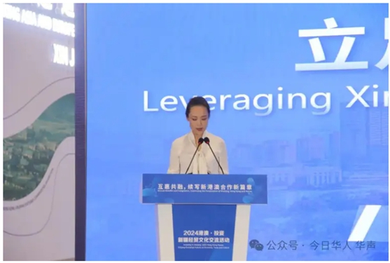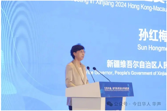 新疆维吾尔自治区人民政府副主席孙红梅致辞。首先,孙红梅对与会嘉宾的莅临表示诚挚欢迎,对长期以来关心支持新疆经济社会发展的香港各界朋友表示衷心的感谢。