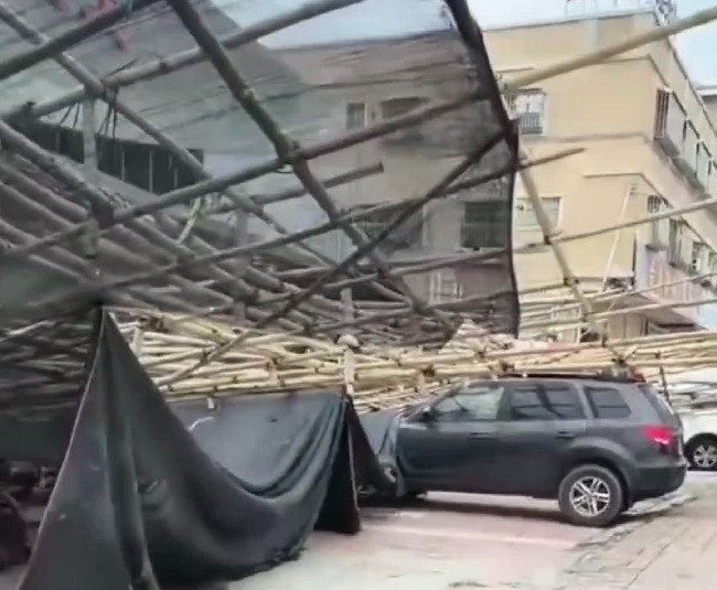 大皖新闻讯 5月23日,有网民发布视频称广东省江门市新会区古井镇一商场装修所用的脚手架突然坍塌,多辆汽车被砸。
