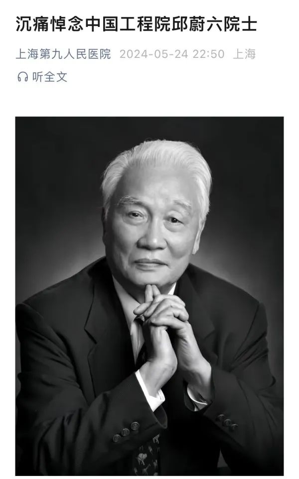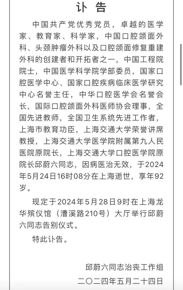 昨天(5月24日)晚上,上海交通大学医学院附属第九人民医院公众号发文,中国口腔颌面外科、头颈肿瘤外科以及口腔颌面修复重建外科的创建者和开拓者之一,中国工程院院士,上海交通大学医学院附属第九人民医院原院长,上海交通大学口腔医学院原院长邱蔚六因病医治无效于昨天下午在上海逝世,享年92岁。