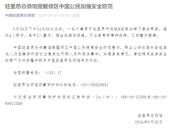 中国驻里昂总领事馆提醒领区中国公民提高安全防范意识,乘坐公共交通时或在其他人流密集场所密切注意身边可疑人员和突发事件。如遇紧急情况,请在确保自身安全前提下及时报警并联系中国驻里昂总领馆寻求协助。