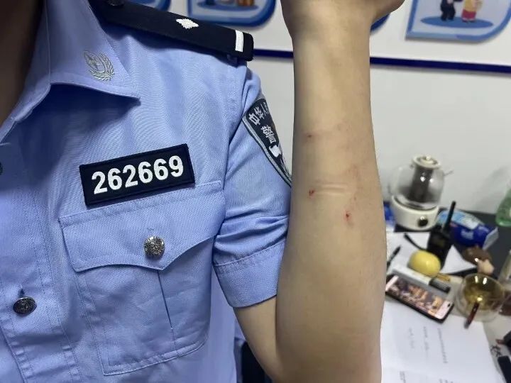 其间民警的手臂被女子抓出多道血印