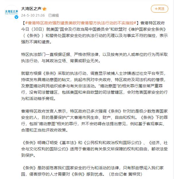 香港特区政府今日(30日)就美国“国会及行政当局中国委员会”和欧盟对《维护国家安全条例》(《条例》)和警务处国家安全处的执法行动的无理以及与事实不符的指控,表示强烈不满和谴责。