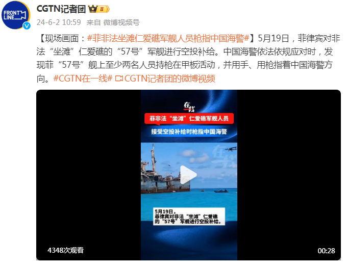 5月19日,菲律宾对非法“坐滩”仁爱礁的“57号”军舰进行空投补给。中国海警依法依规应对时,发现菲“57号”舰上至少两名人员持枪在甲板活动,并用手、用枪指着中国海警方向。