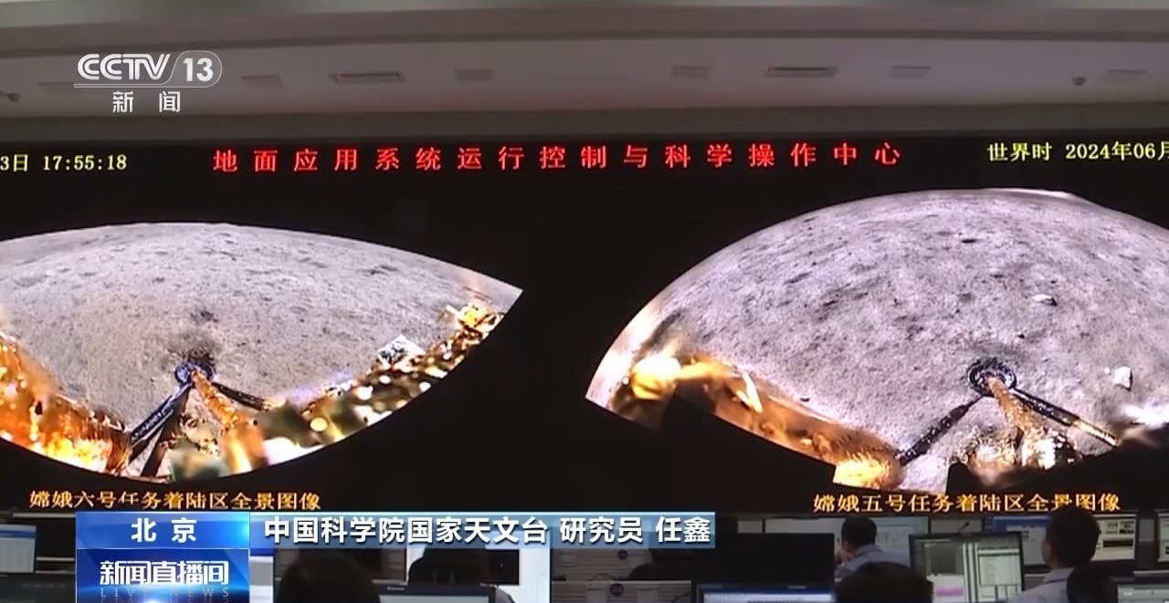 总台央视记者 帅俊全:我所在的中国科学院国家天文台,就是我国探月工程地面应用系统所在地,嫦娥六号所搭载的科学载荷的有效数据,都会第一时间回传到这里进行分析处理等。现在大屏上可以看到的就是嫦娥六号在月球背面的着陆区所拍摄到的一张非常珍贵的全景图。