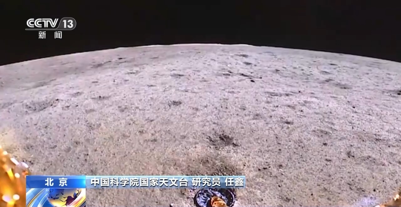 中国科学院国家天文台研究员 任鑫:从这张全景图看到的是着陆区特别平坦,首先反映出安全着陆区选的比较好,在远处的地方可以看到有一些山,这个实际上是在地平面以外更远距离的阿波罗盆地的一些环形坑的边缘。