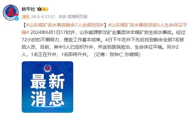 2024年6月1日17时许,山东能源新汶矿业集团华丰煤矿发生突水事故。经过72小时的不懈努力,搜救工作基本结束。4日下午在井下先后找到剩余全部7名被困人员,目前,其中5人已组织升井,并送到医院救治,生命体征平稳。另外2人,1名正在升井,1名即将升井。(记者:张钟仁 孙晓辉)