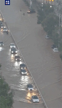 在玉林二环东路海关路口,积水已没过膝盖,在此路段,多辆电动车也被困在积水中,救援人员合力将车辆和群众转移。
